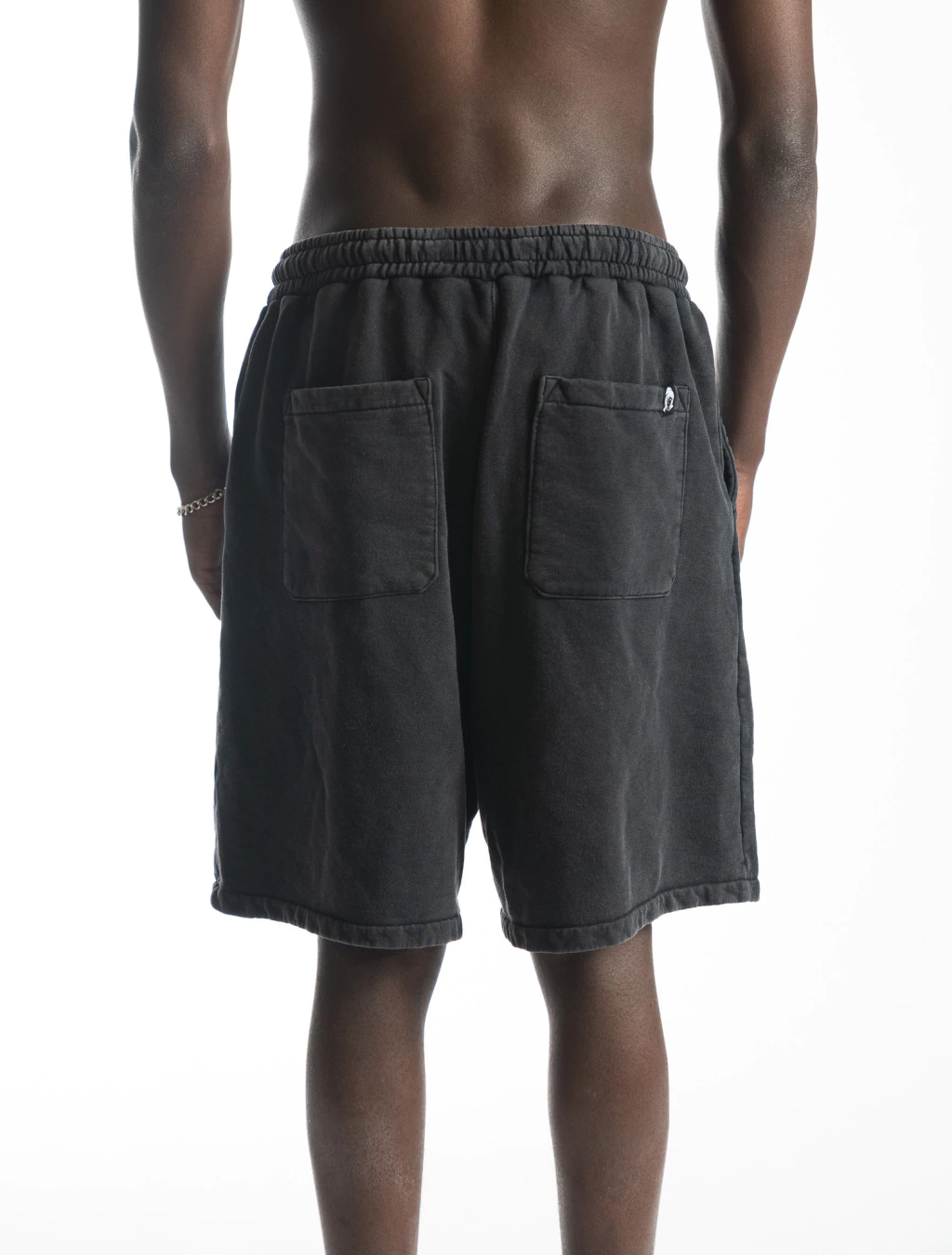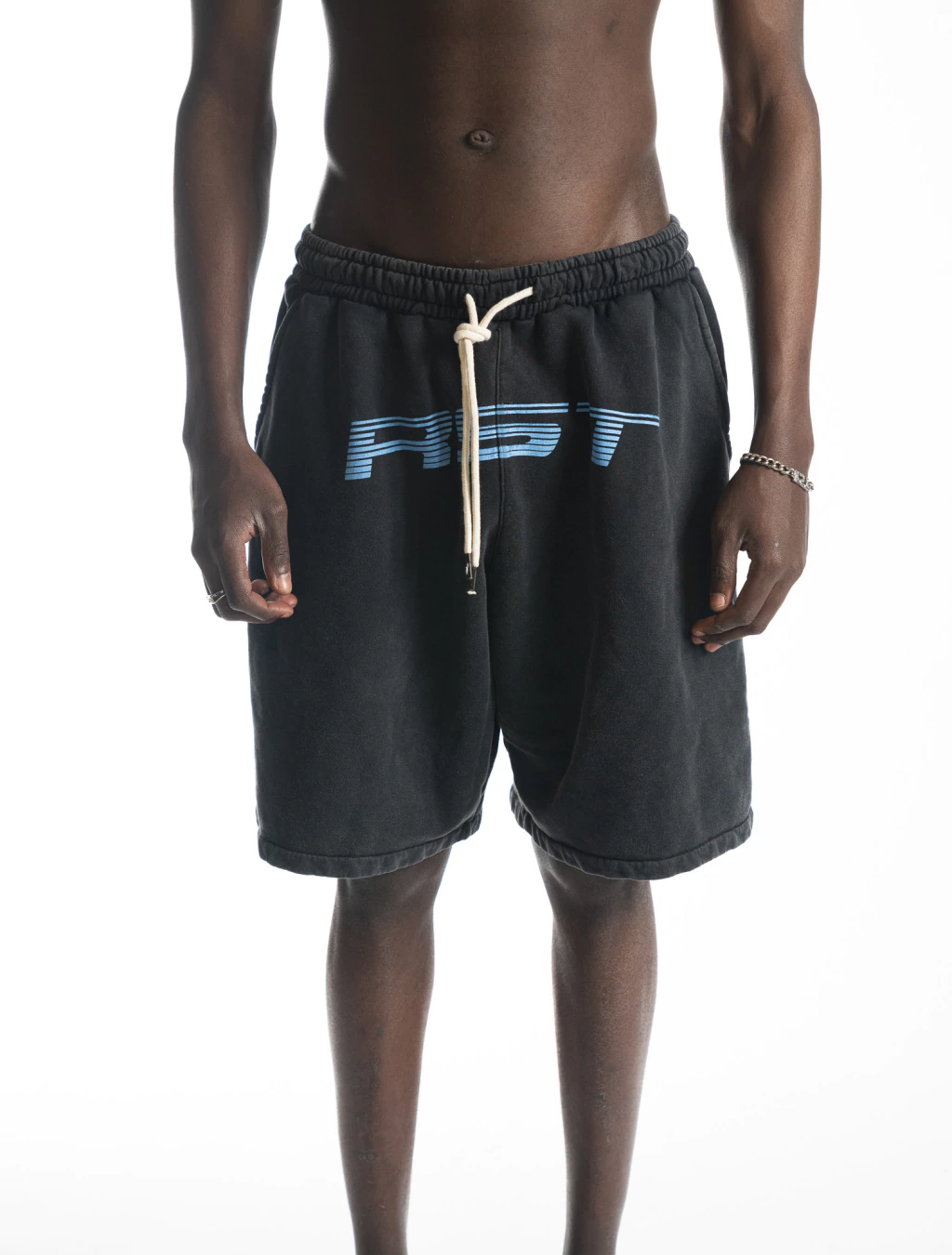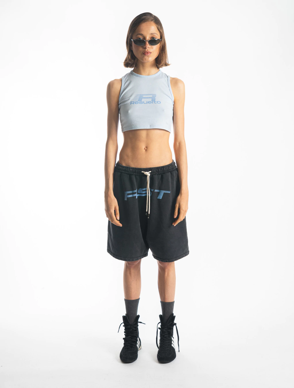 Bermuda confeccionada en un Rustico negro, liviana, ideal para esta temporada. Esta prenda pasó por un proceso de bajada de color, logrando este color vintage black. Cuenta con su estampa protagonista en color celeste en el frente y cordones color crudo.