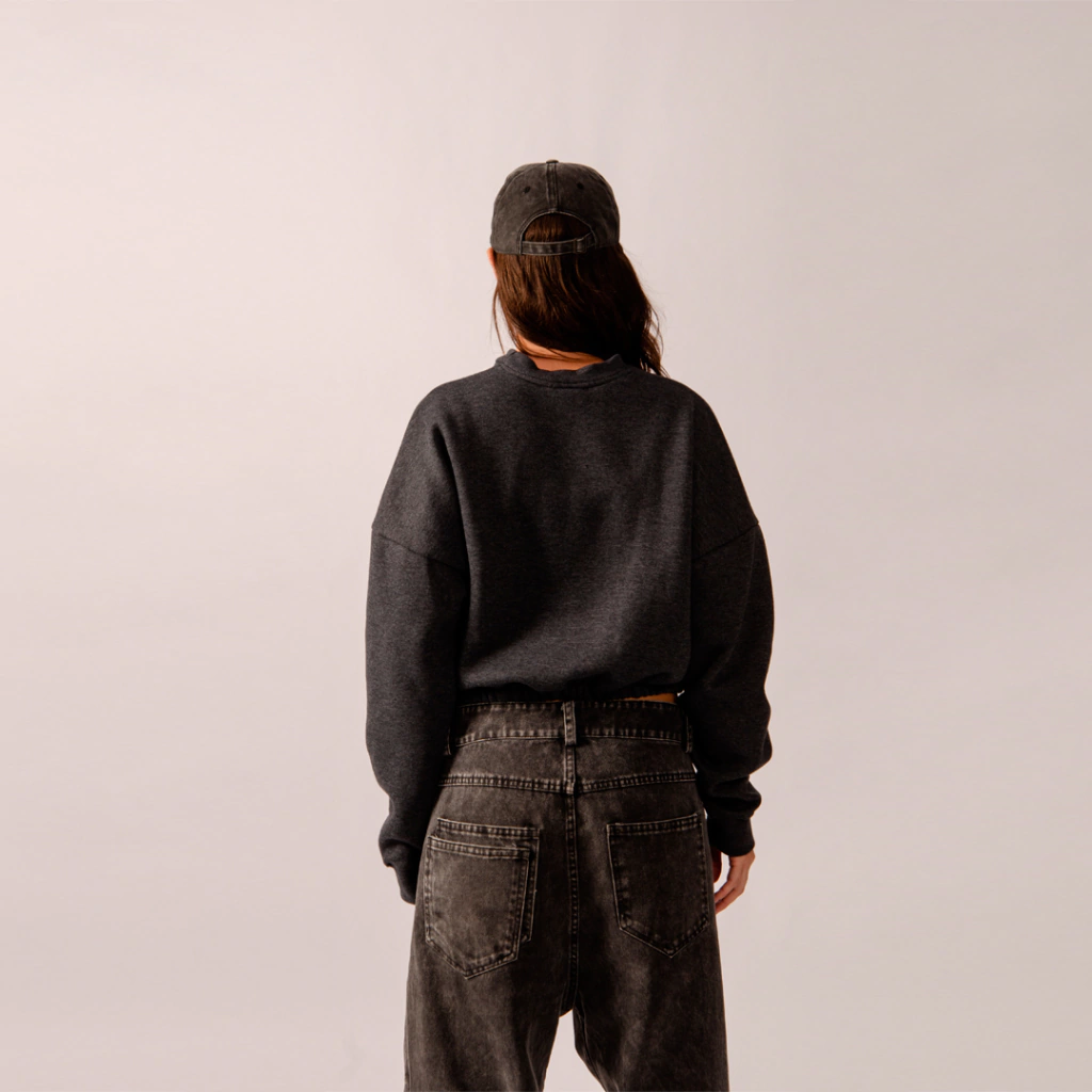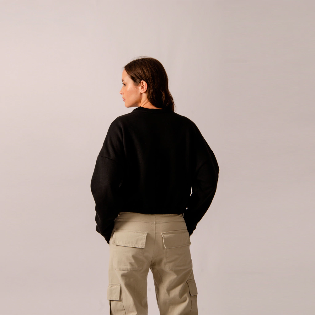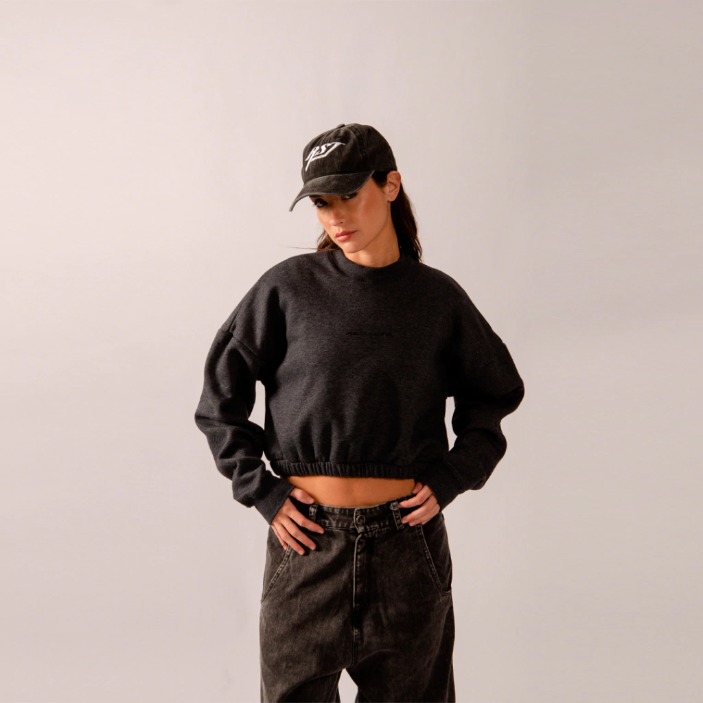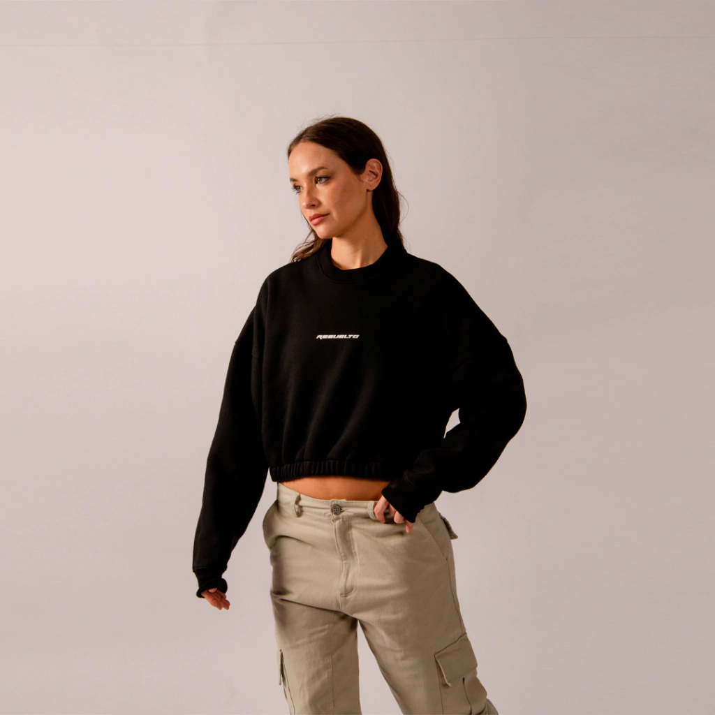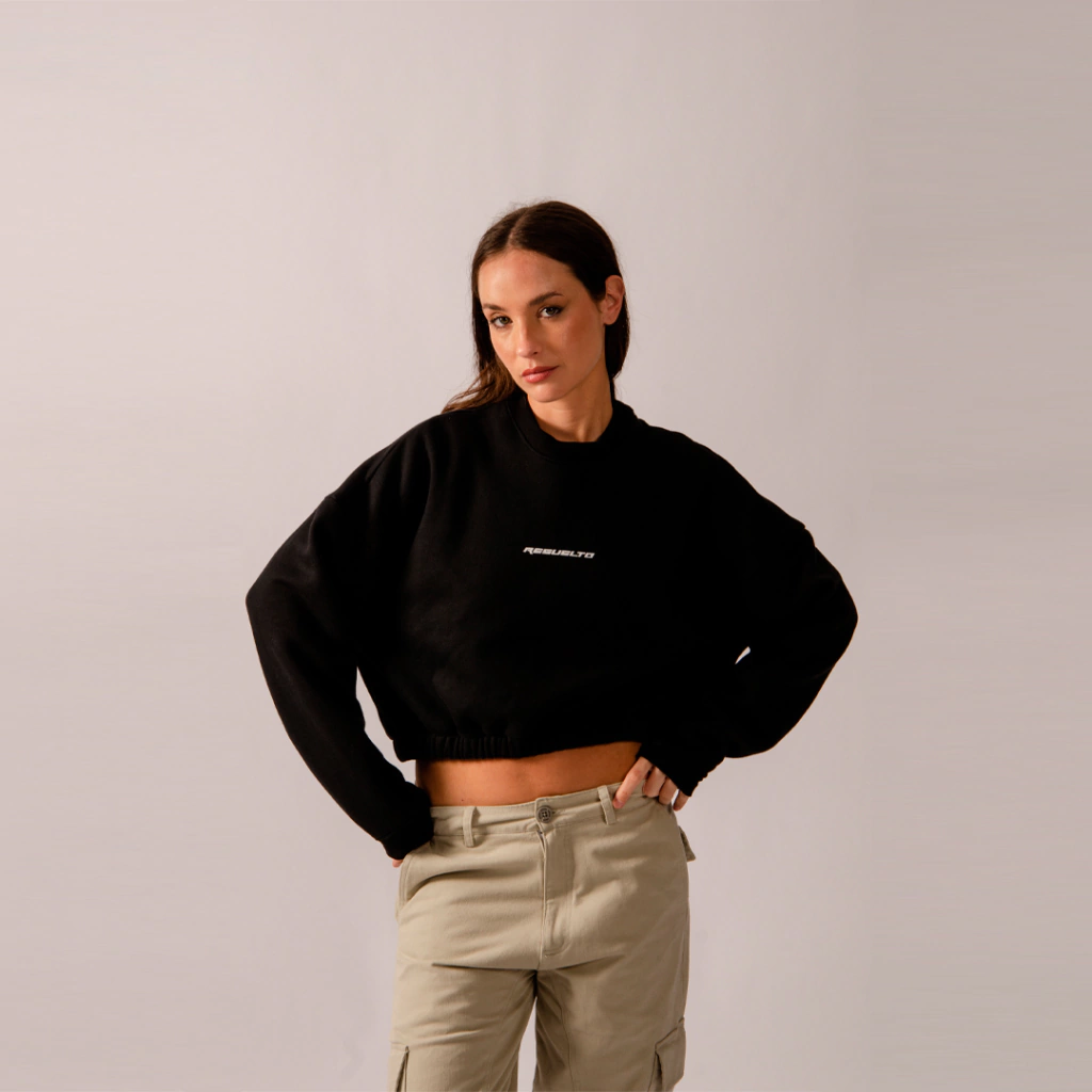 Buzo de calce crop confeccionado en friza. Cuello redondo, puños y cintura confeccionada en morley. Se encuentra el logo estampado en el frente, centrado, con técnica al agua.