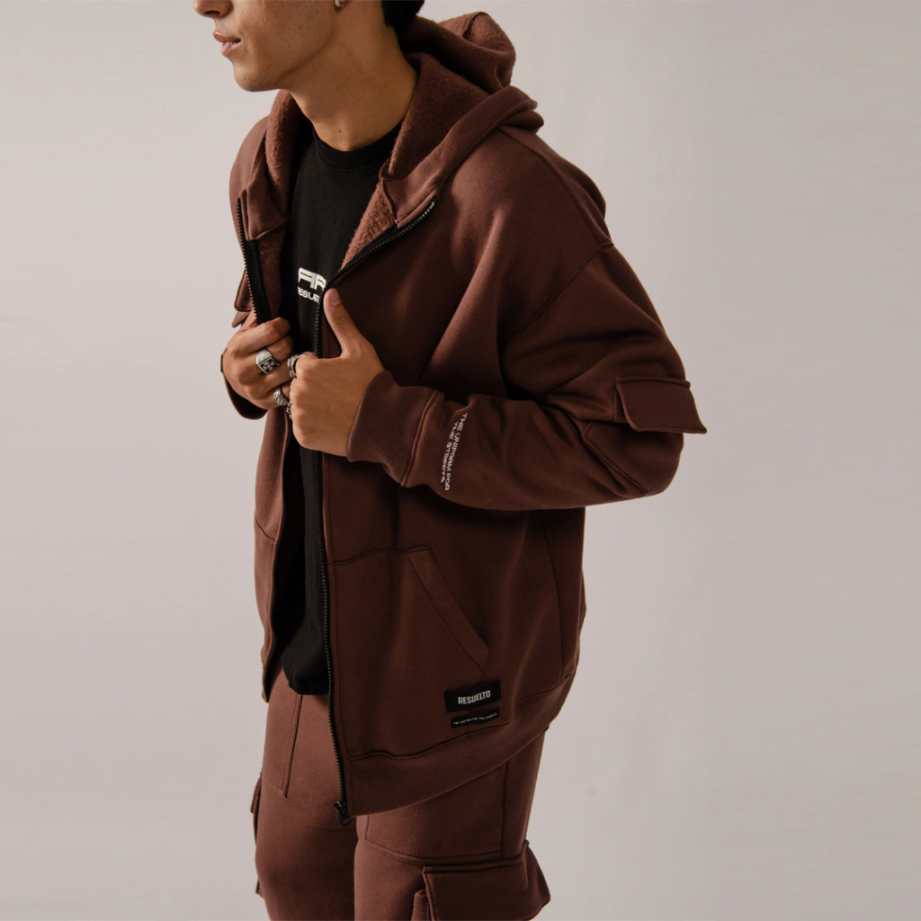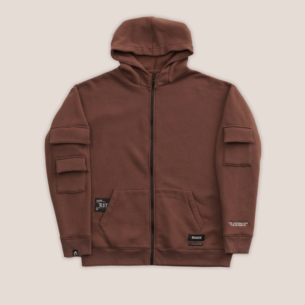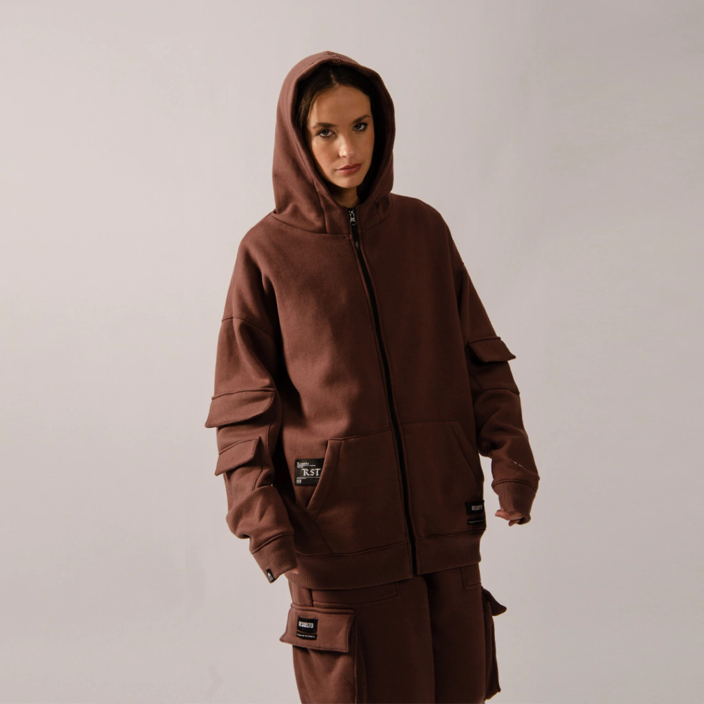 Hoodie con cierre confeccionado en una frisa pesada color chocolate. Se destaca por sus multiples bolsillos que lo hacen un buzo cargo bastante original y las etiquetas de marca para su comunicación en todo el contorno. También cuenta con una frase bordada en una de las mangas.