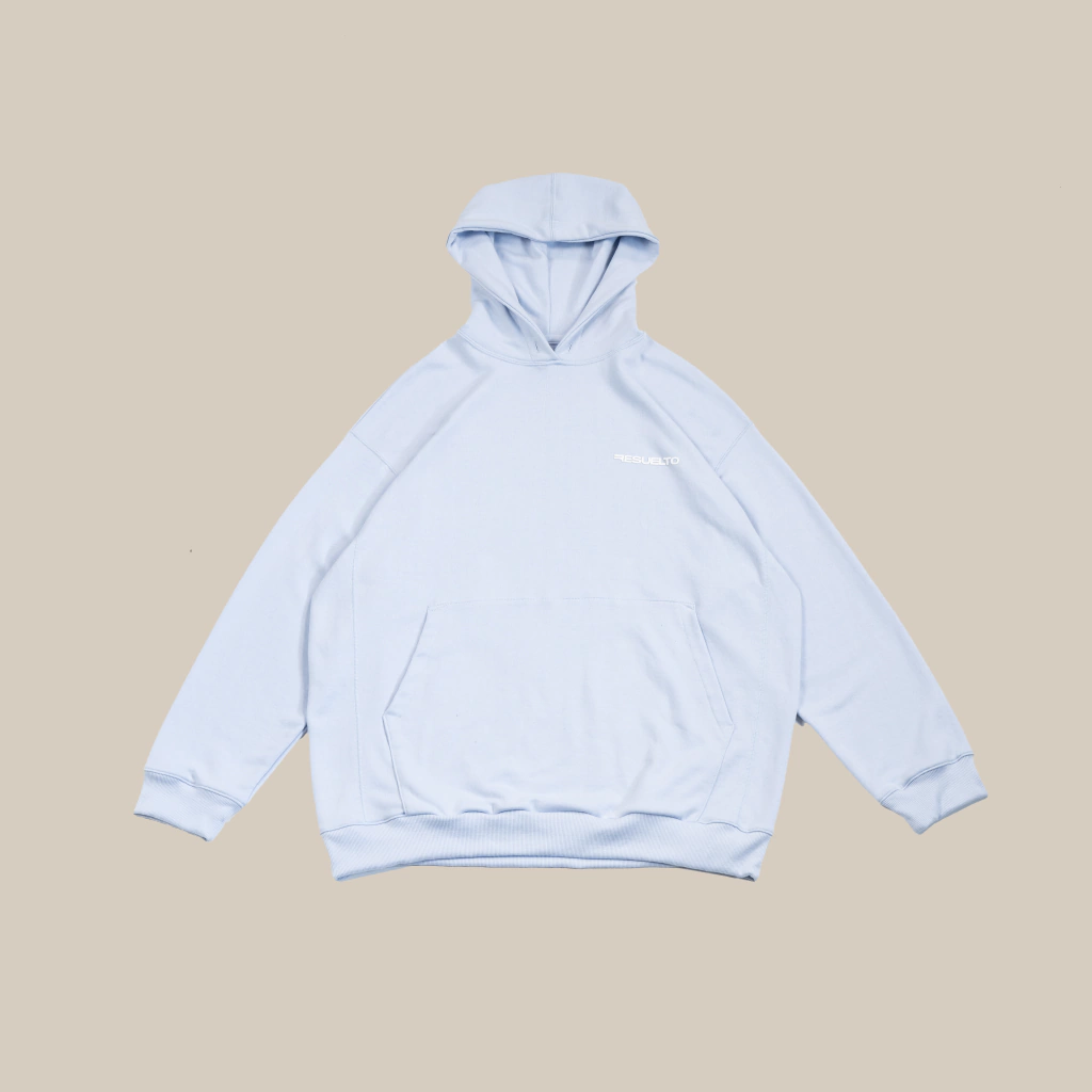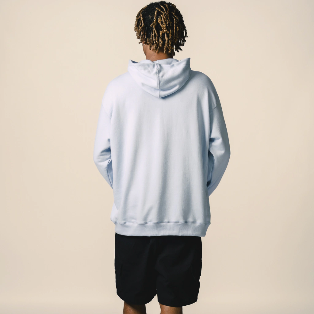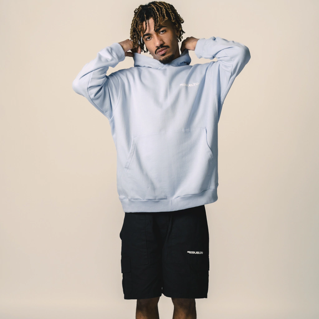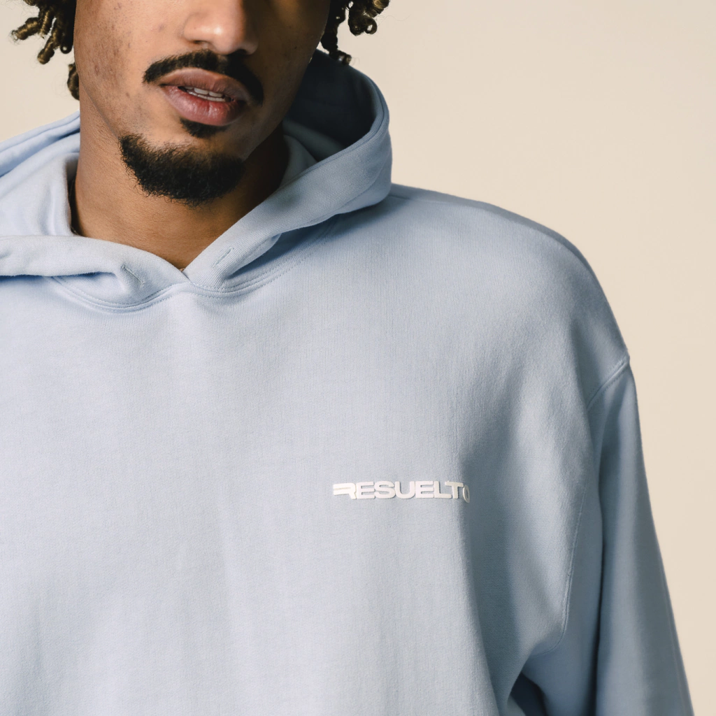Hoodie confeccionado en un rústico celeste, de mucha calidad y suave al tacto. Se destaca en su diseño por sus recortes laterales y estampa minimalista con sobrerelieve en frente, color blanco. Cuenta con cordones a tono y ojales metalicos en la capucha. Terminación con complemento bien ancho.