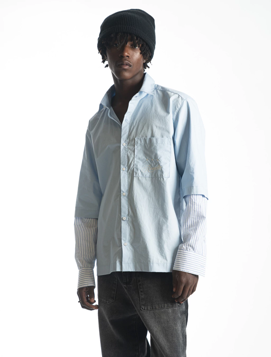 Camisa manga larga confeccionada combinando Poplin celeste listo con otro Poplin rayado generando así una doble manga. Se destaca por su suavidad en la tela y el calce perfecto que logra. Cuenta con bordado en color blanco en el bolsillo delantero.