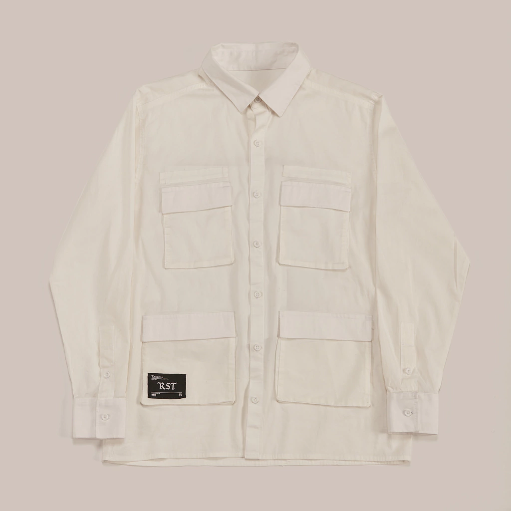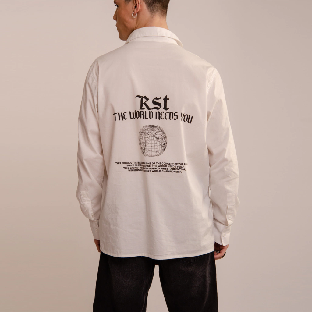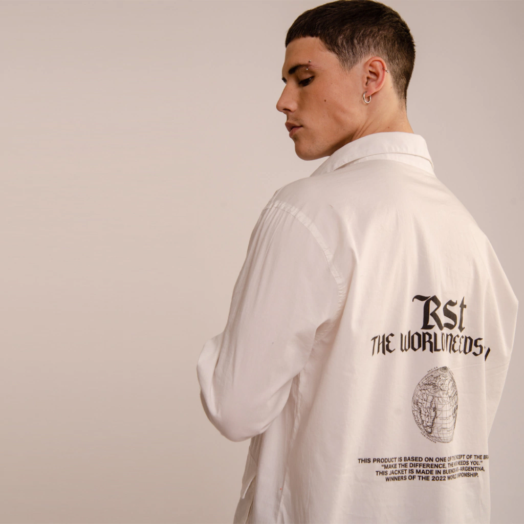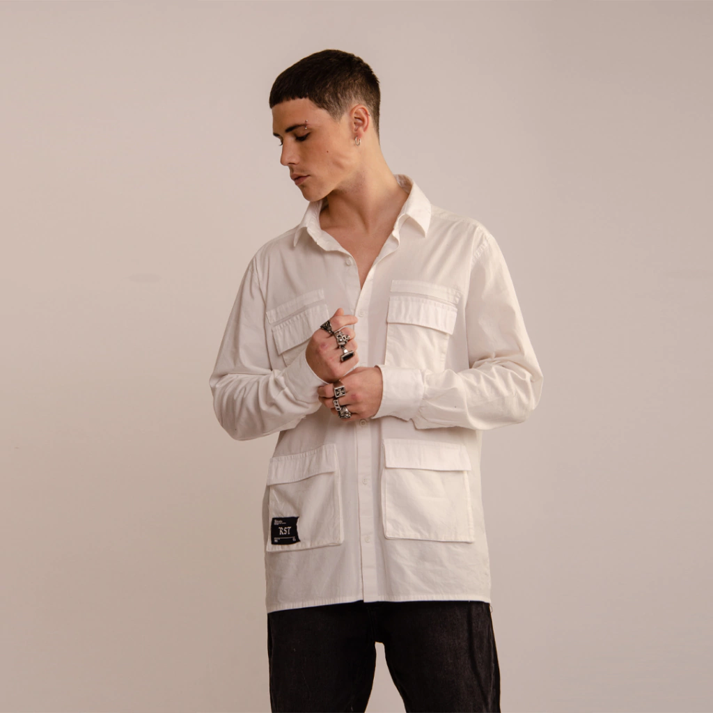 Es una prenda pensada desde la formalidad de una clásica camisa blanca pero armamos nuestra versión con bolsillos cargo en el frente de la prenda y una estampa que abarca la espalda. Está confeccionada en Poplin de mucha estructura.