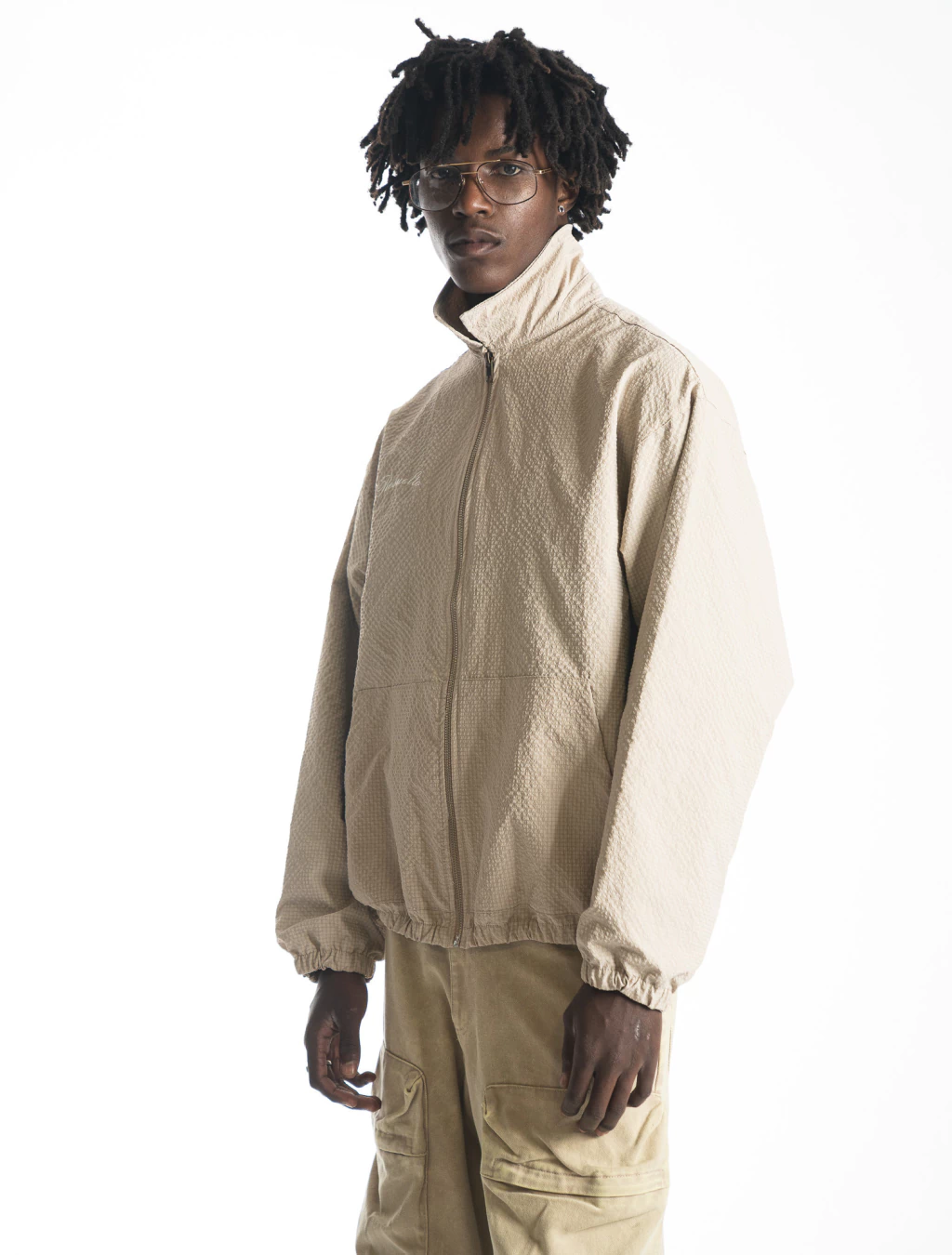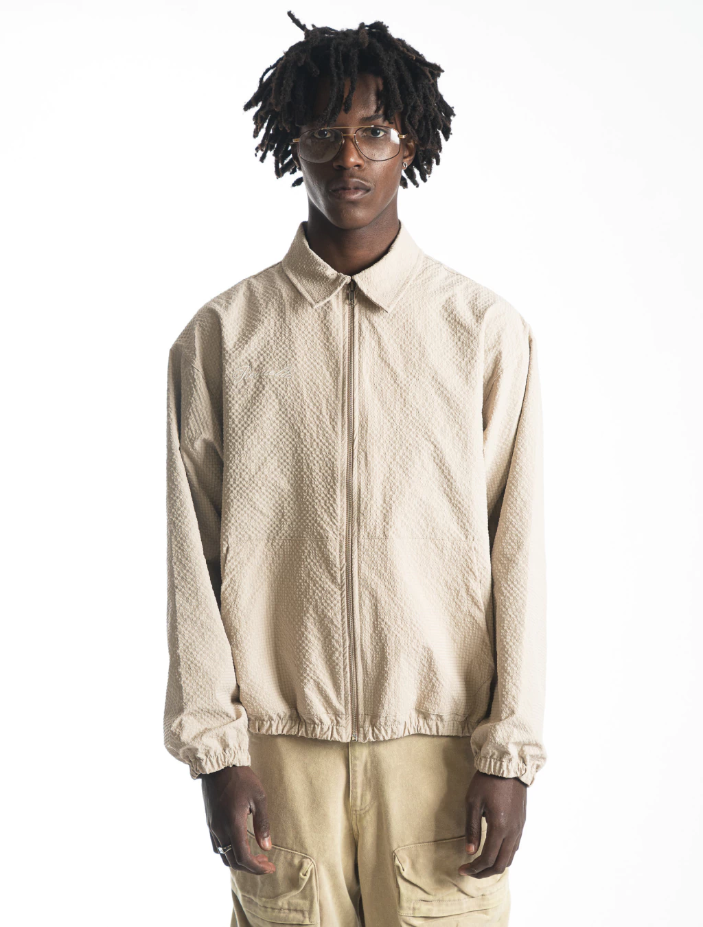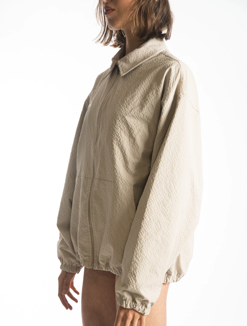 Campera confeccionada en Paper Taco; tela con apariencia y textura de papel, con estructura y una tremenda caída. Para acompañar al clima, la misma esta forrada en una microfibra verde, dandole ese toque de color a la prenda. Es completamente única por la tela que lleva.