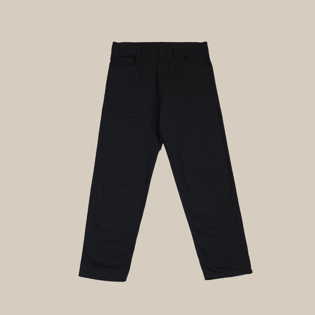 Jean oversize color negro, confeccionado en un Denim grueso de 12 onzas. Se caracteriza por ser una prenda de tiro mas bajo con piernas y cintura holgadas, logrando que en la botamanga se acumule tela.