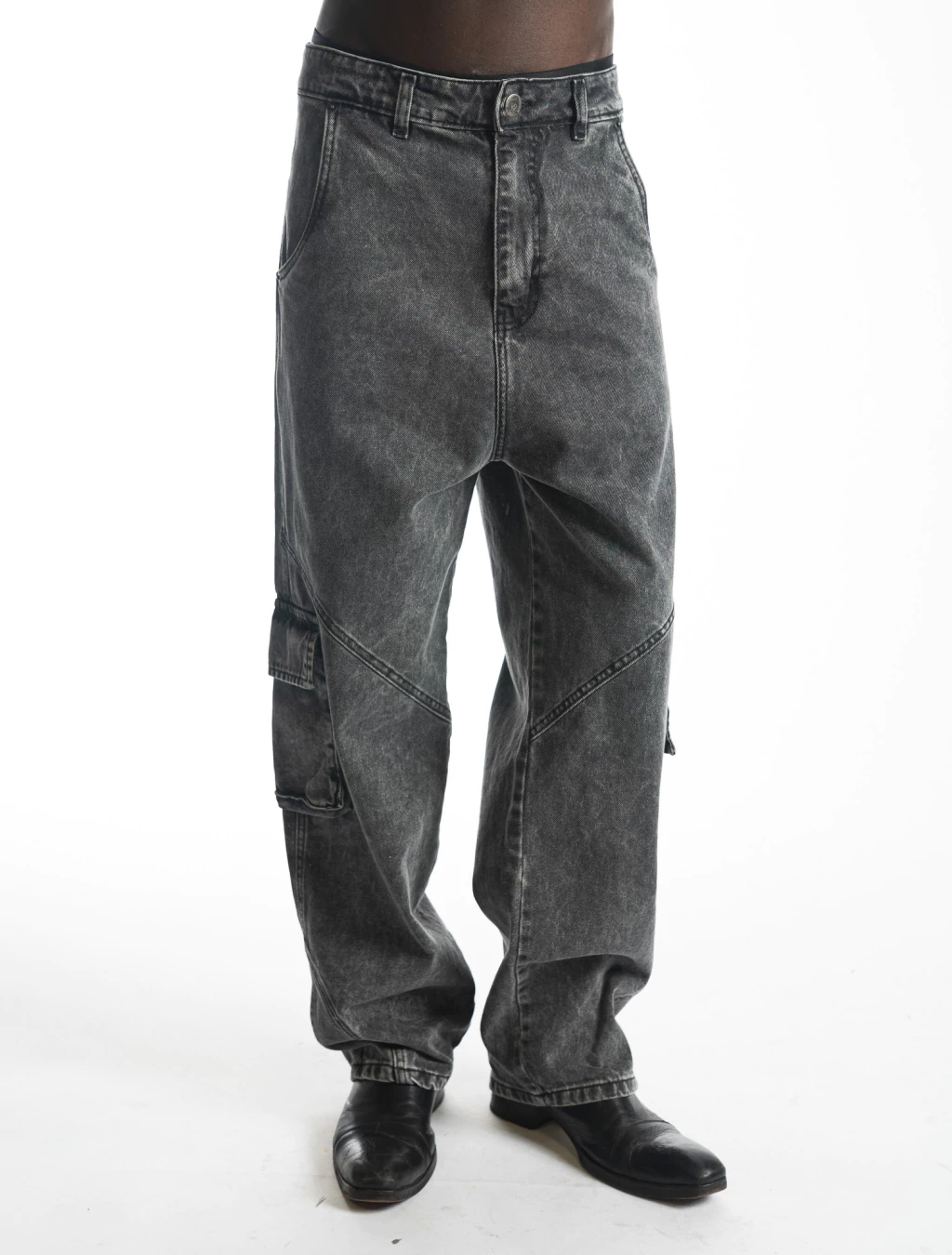 Este Jean cargo se caracteriza por ser una prenda de tiro medio con multiples bolsillos y recortes, acompañado por un proceso de lavado logrando un efecto desgastado y una bajada de color que lo hace que sea la estrella de la colección.
