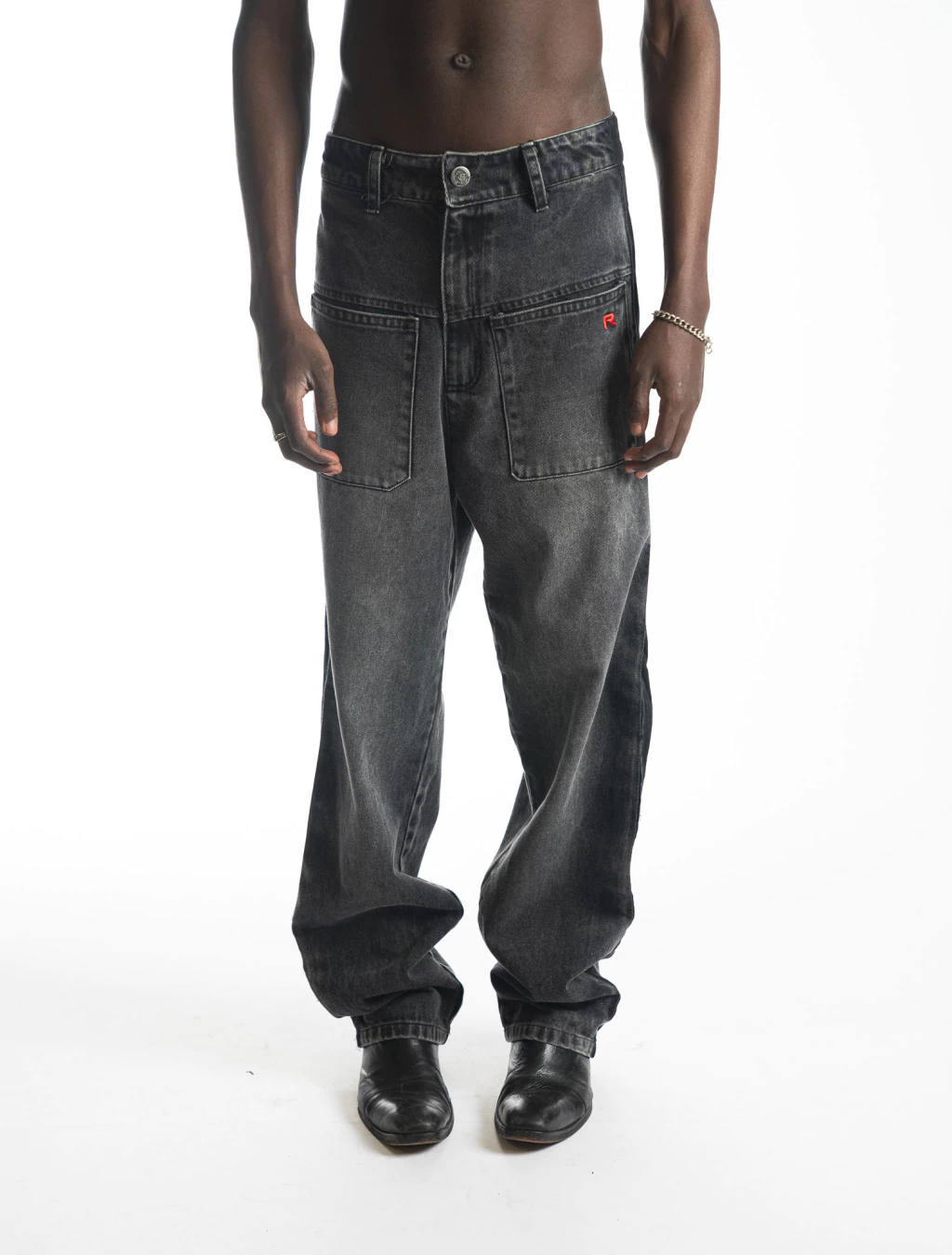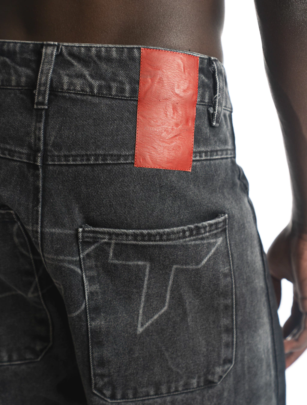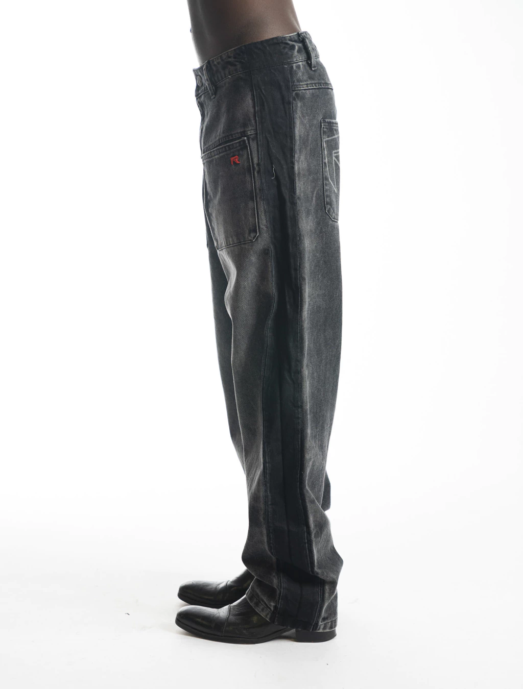 Jean oversize confeccionado en un denim negro 100% algodón. Se diferencia del resto al tener 2 tipos de lavados diferentes, llegando a un stone washed en todo el jean salvo en las franjas laterales, que mantienen un negro pleno logrando estas reservas de color en laterales. Por último, en frente, bolsillos del mismo estilo que los traseros con bordado color rojo.