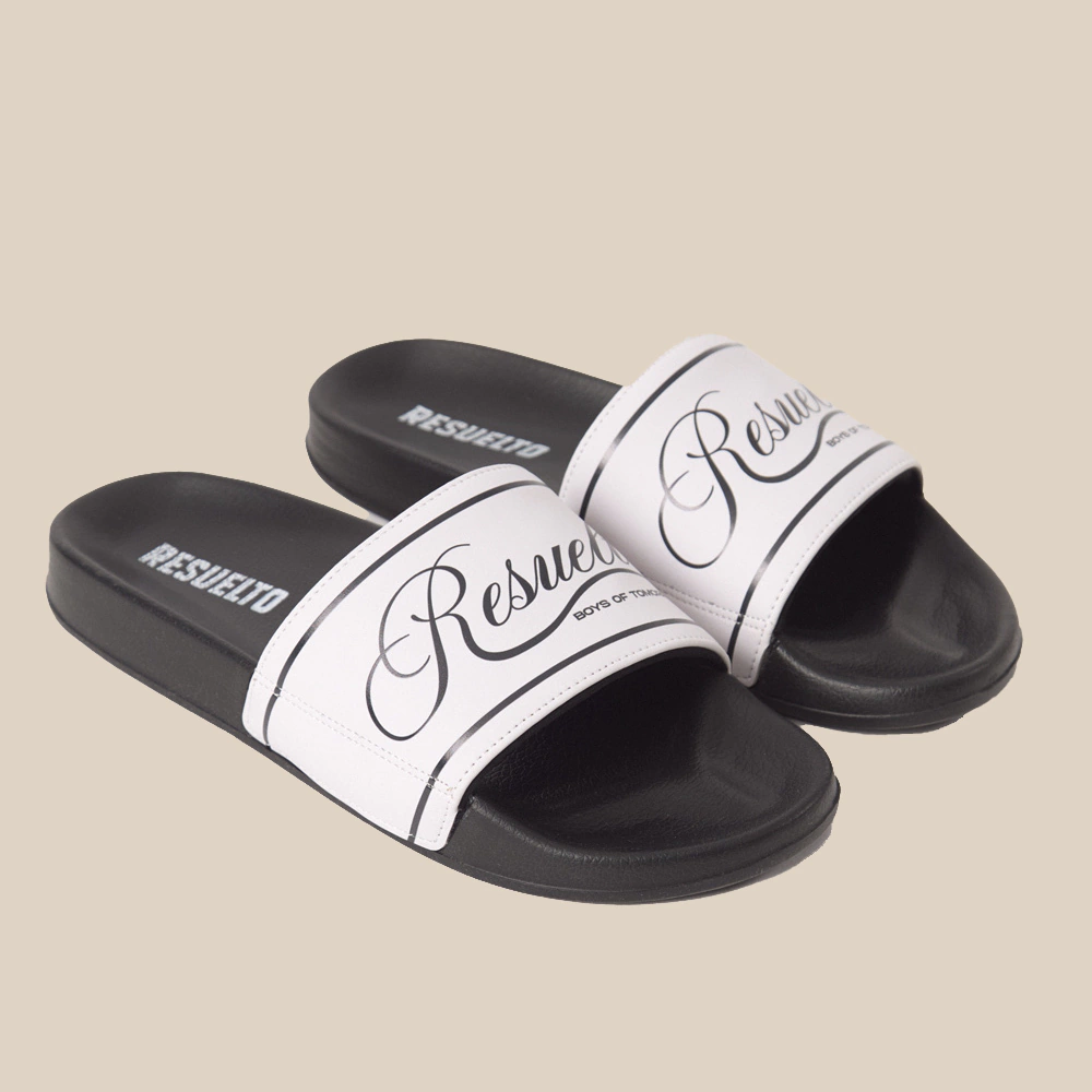 Ojota de color negro con suela confeccionada en eva, capellada color beige en PVC de 1,2 MM y forro espumado de 8 MM, con estama serigrafiada y alta frecuencia. Cuenta con el RST en todo el largo de la capellada.