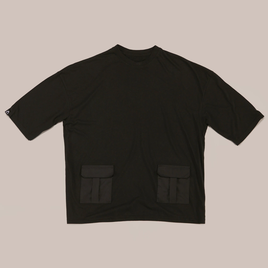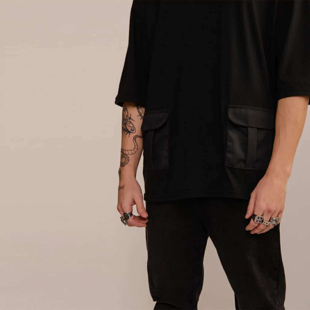 Remera extraoversize confeccionada en un Jersey liviano, pensada para distinguirse del resto con sus dos bolsillos cargo en el delantero de la prenda. Calce extraoversize con mangas hasta los codos.