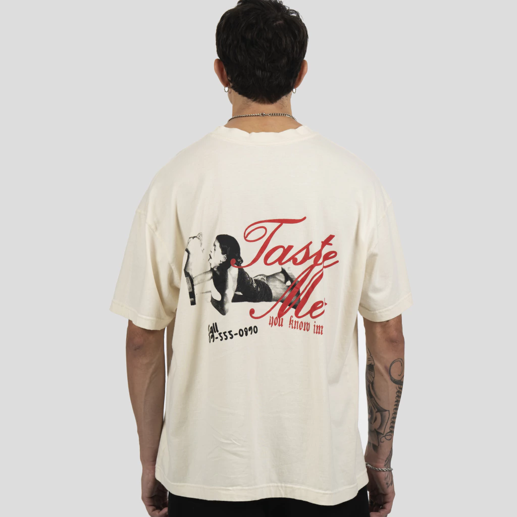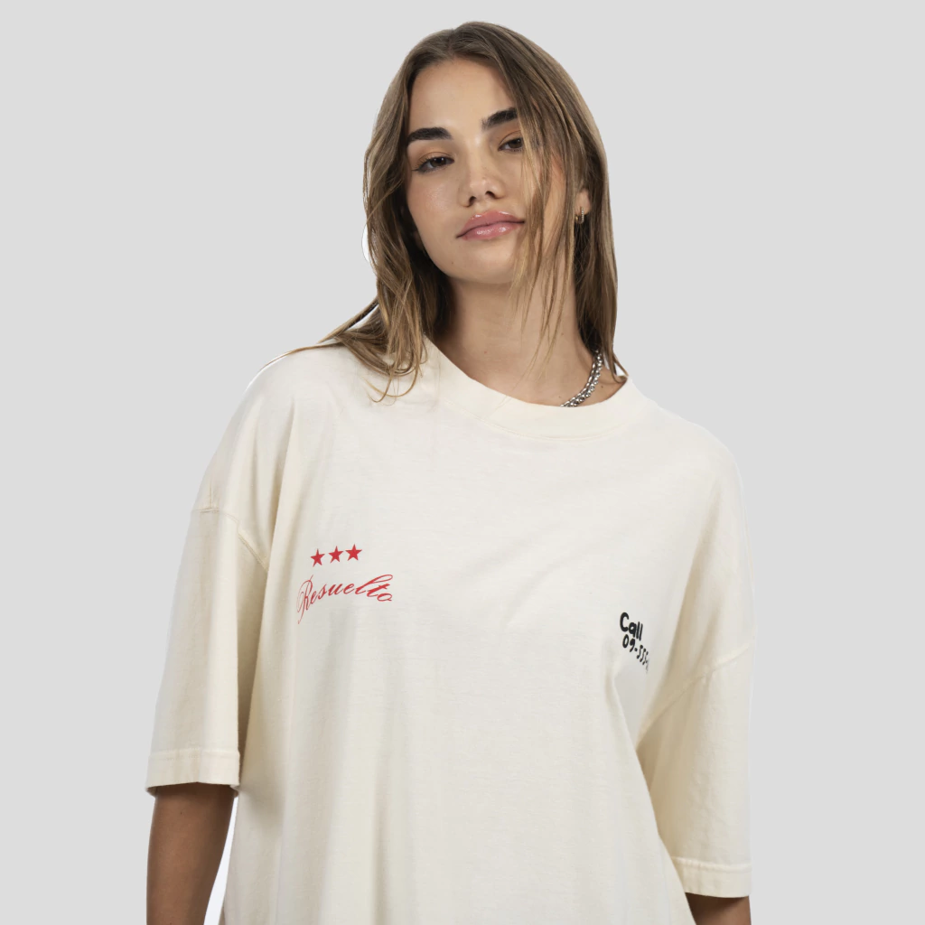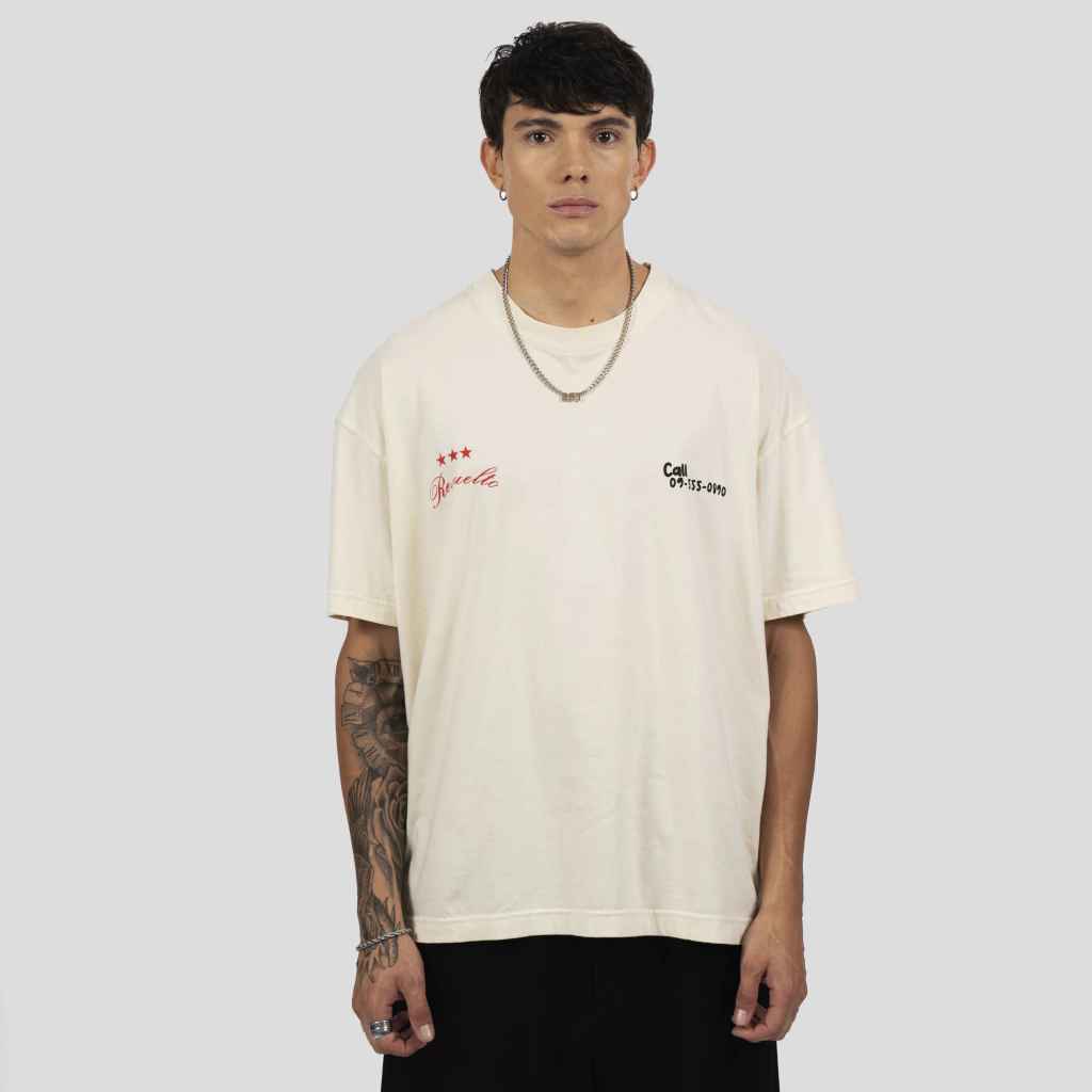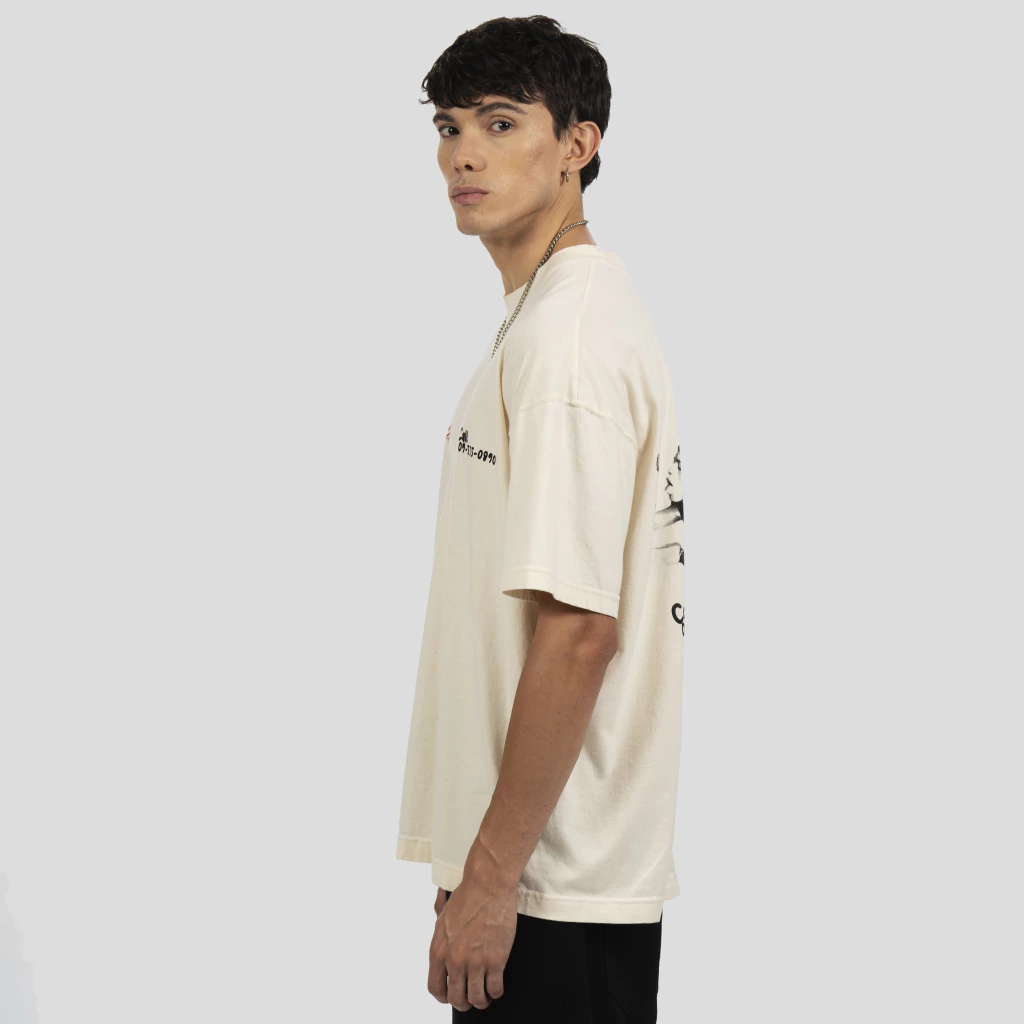 Remera manga corta confeccionada en un Jersey 24/1 color crudo, pensada para distinguirse del resto por sus estampas serigráficas en el frente y espalda de la prenda, con un diseño que refleja nuestro proceso creativo desarrollado a lo largo de esta colección FW25. Combinación de colores que queda muy bien sobre el color de la tela base.